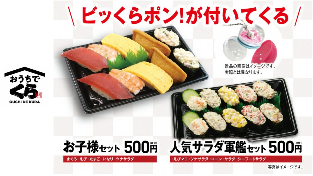無添くら寿司 公式 Twitterren ビッくらポンつき くら寿司のお持ち帰り お子様に大人気のお寿司がいっぱいの お子様セット 人気サラダ軍艦セット 今ならビッくらポンのガチャ玉がついてくる くら寿司アプリなら お持ち帰りも簡単予約